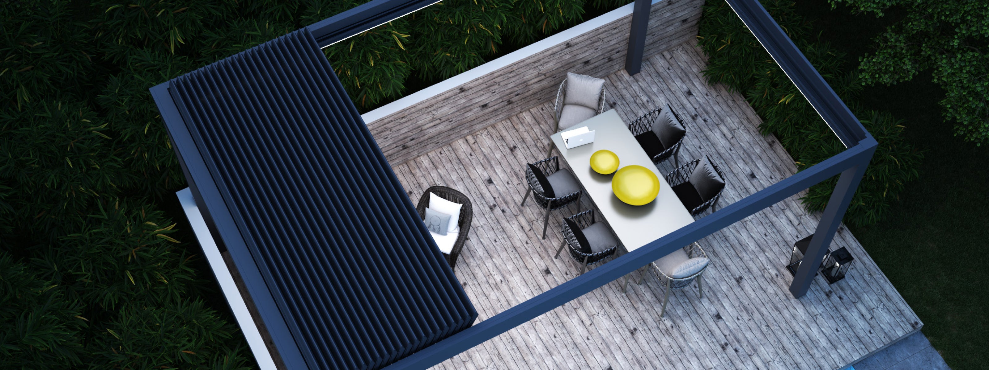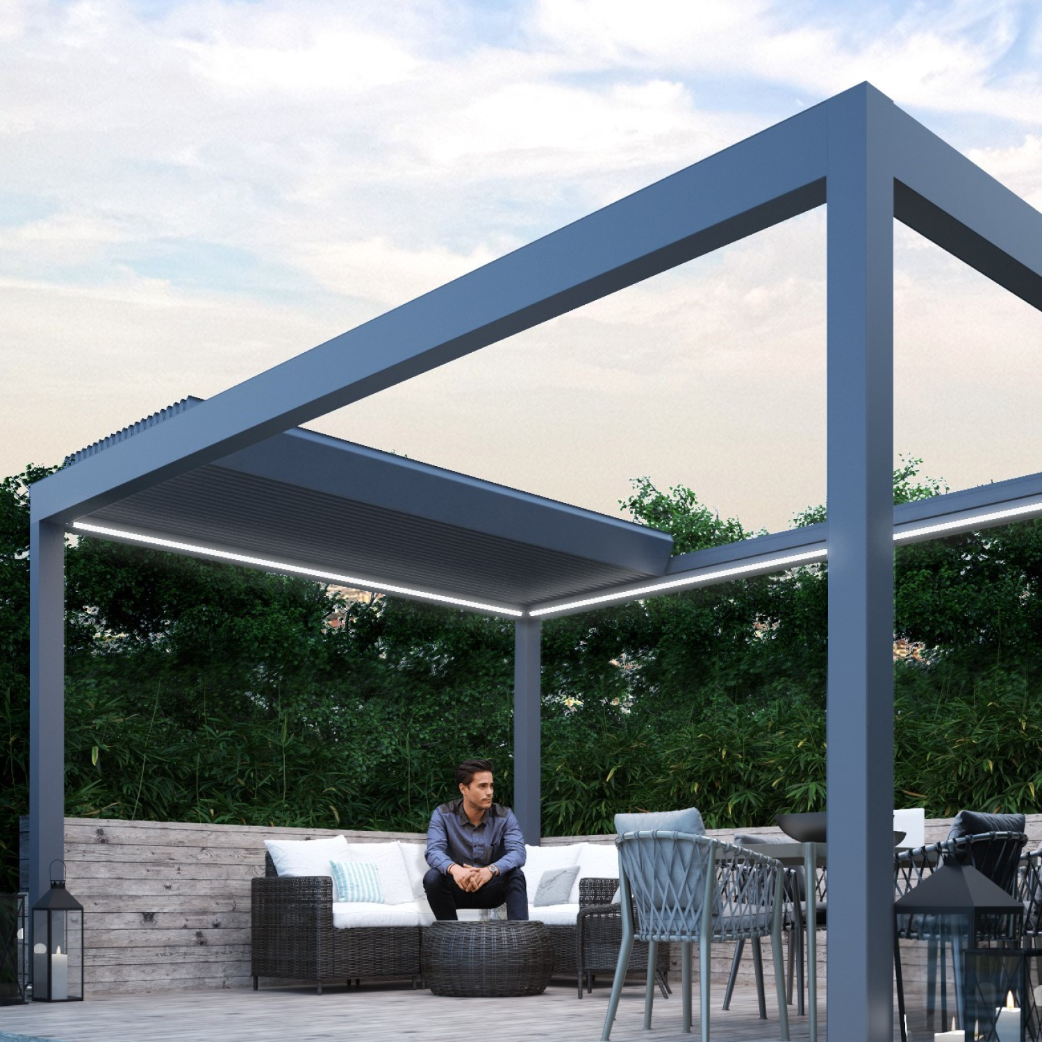 Fully controlled outdoor rooms with electric louvred roofs, integrated lighting, and refined detailing. Architectural statement spaces with complete environmental control.