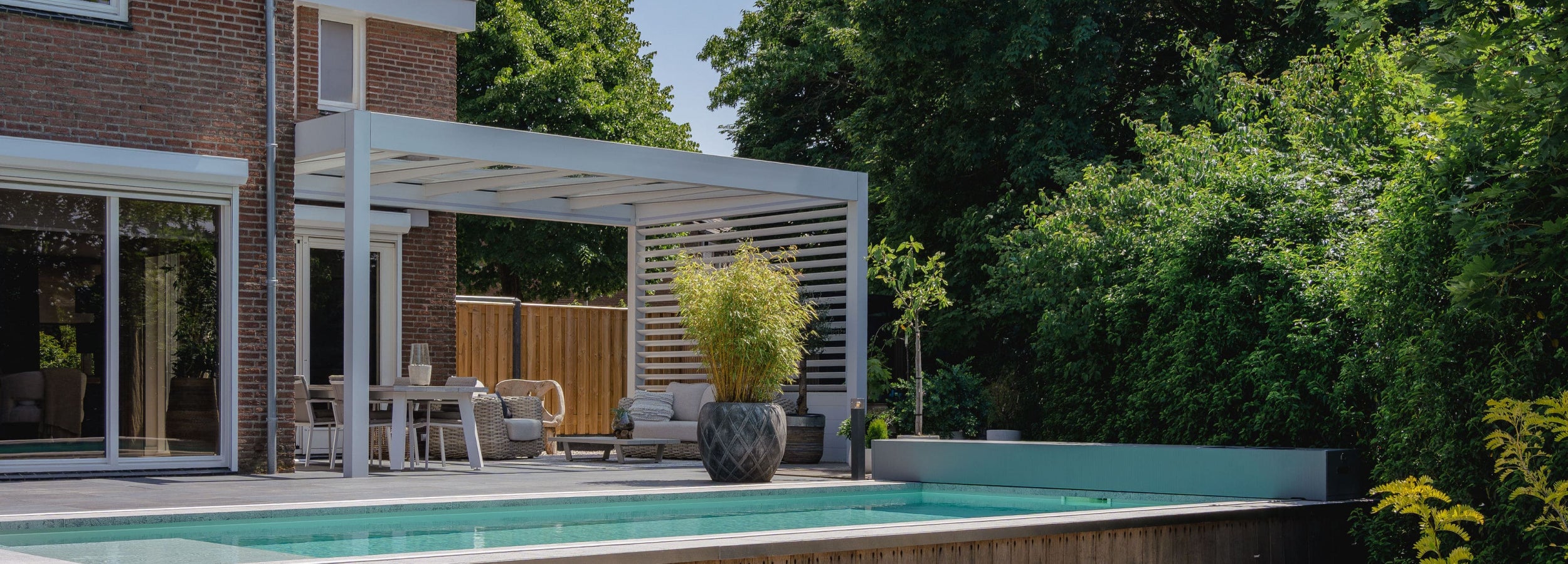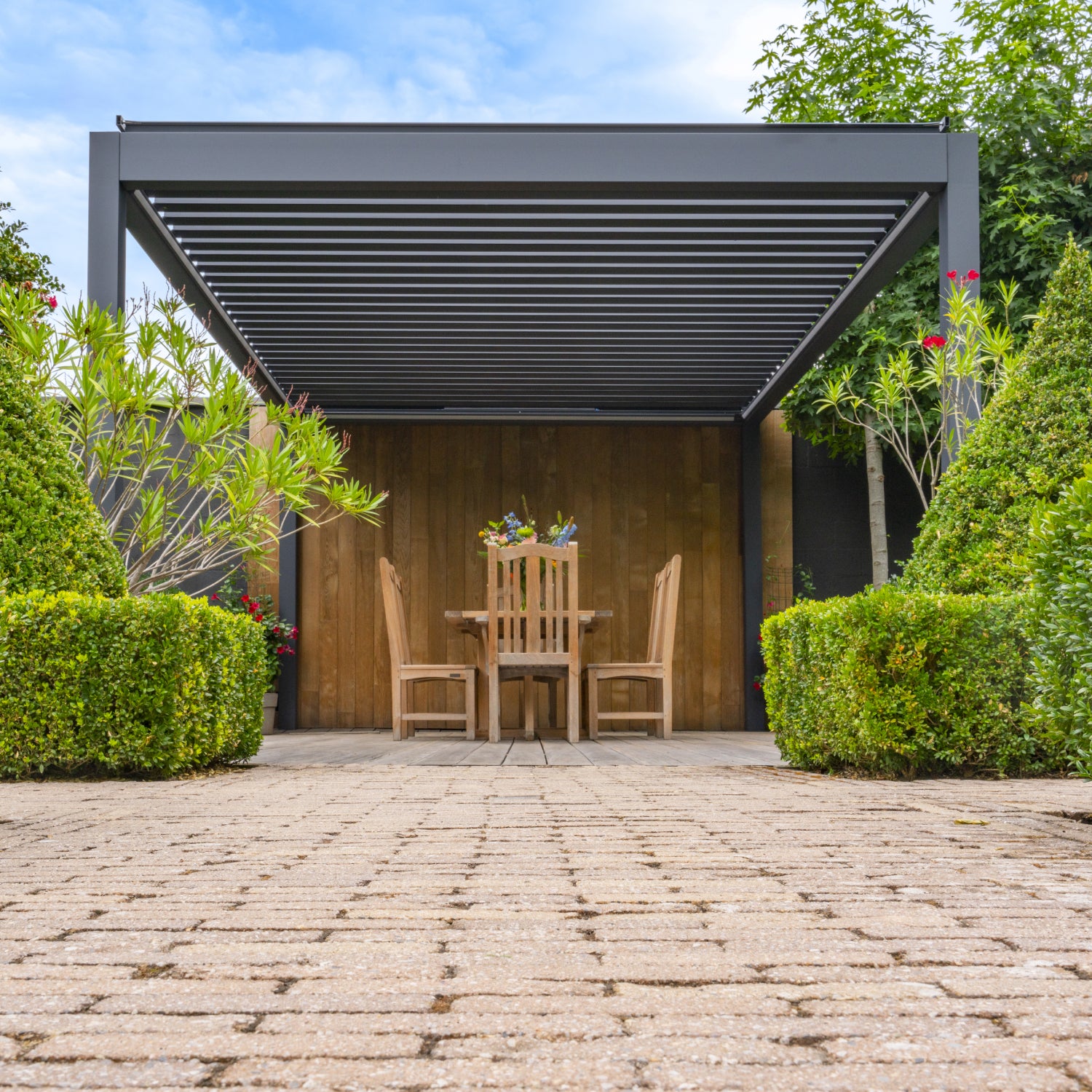 A flat roof pergola with electronically adjustable aluminium louvres, allowing you to control sunlight, shade, and ventilation throughout the day. Well-suited to south-facing gardens and spaces used regularly for entertaining.